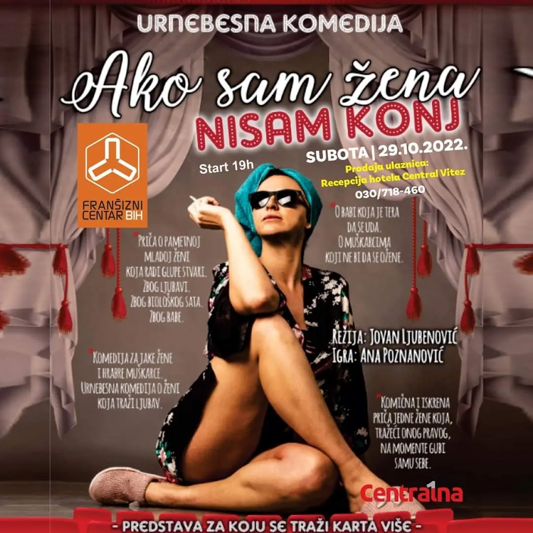 Urnebesna komedija „Ako sam žena nisam konj“, zbog velikog zanimanja i interesa publike održat će se u 29.10.2022.godine u Vitezu, u Franšiznom centru s početkom u 19 sati.