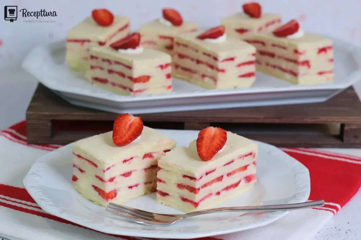 Ovaj kolač radi se sa standardnim pakiranjem rozen kora od osam komada i sedam slojeva kreme, tako da zaista bogat i izdašan. Krema je iznimno nježna jer se radi s brašnom, mlijekom i šećerom, te naravno vanilin šećerom koji joj daje onu toliko finu aromu vanilije koja se posebno dobro slaže upravo s jagodama.