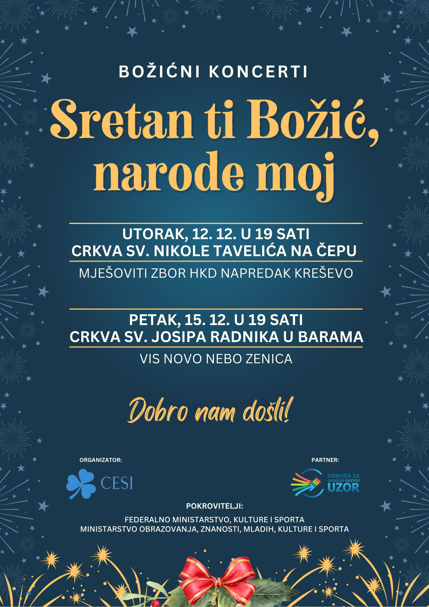 “Uz brojne kulturne i druge sadržaje koje tijekom cijele godine organiziramo kroz našu udrugu, želja nam je bila i ove godine, kao dio manifestacije “Božić u Busovači”, a u suradnji sa istaknutim glazbenicima i sastavima, organizirati dva božićna koncerta u našim filijalnim crkvama, te tako svima nama uljepšati blagdan mira, ljubavi i veselja koji očekujemo za 10-ak dana. Vjerujemo da smo u tome uspjeli na Čepu, stoga vas sve pozivamo da dođete i sutra u Bare, u filijalnu crkvu sv. Josipa Radnika, na naš drugi koncert, kako bi u radosti i s pjesmom dočekali Božić, najradosniji kršćanski blagdan”, istaknuo je u prigodnom govoru Bojan Petrović, predsjednik udruge CESI.