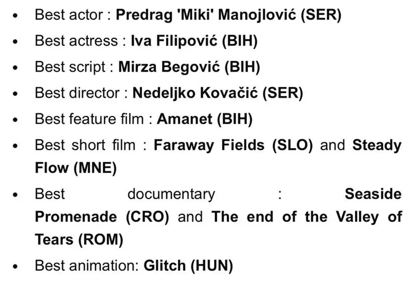 Osim Amaneta na Festivalu su sudjelovali i srbijanski film “Vera”, makedonski film “Cinema love”, srbijanski film “Trail of the Beast” u kojem igra Predrag Miki Manojlović, dobitnik nagrade za najboljeg glumca kao i drugi filmovi iz zemalja sudionica, prenosi Klix.