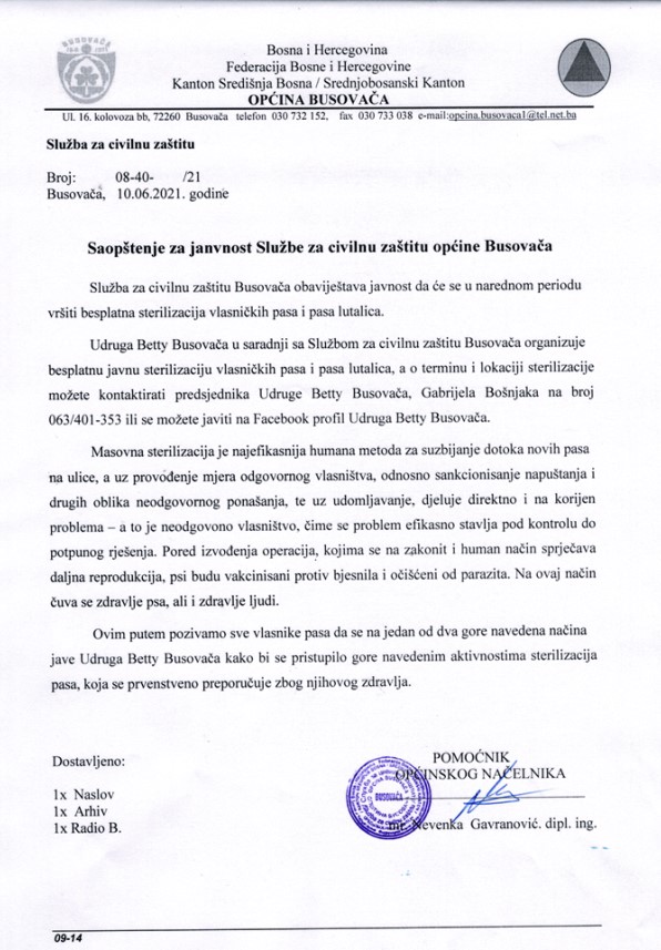 Pročitajte priopćenje za javnost Službe za civilnu zaštitu općine Busovača:
