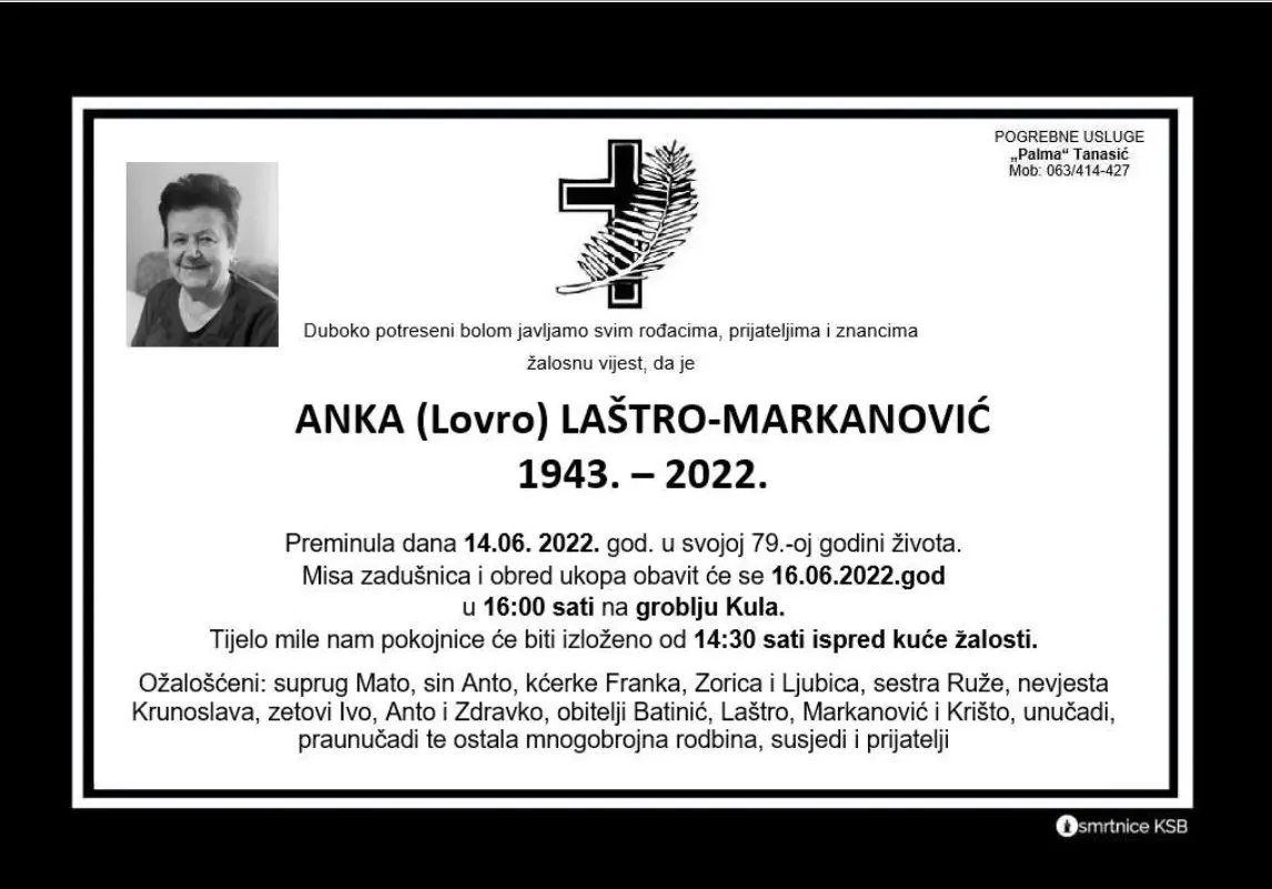 Anka (Lovro) Laštro – Markanović preminula je dana 14. lipnja 2022. godine u svojoj 79-oj godini života.