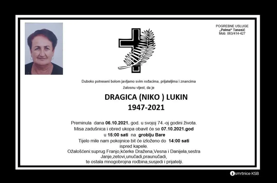 Preminula dana 6.10. u svojoj 74.oj godini života. Misa zadušnica i obred ukopa obavit će se dana 7.10. u 15:00 sati na groblju Bare.