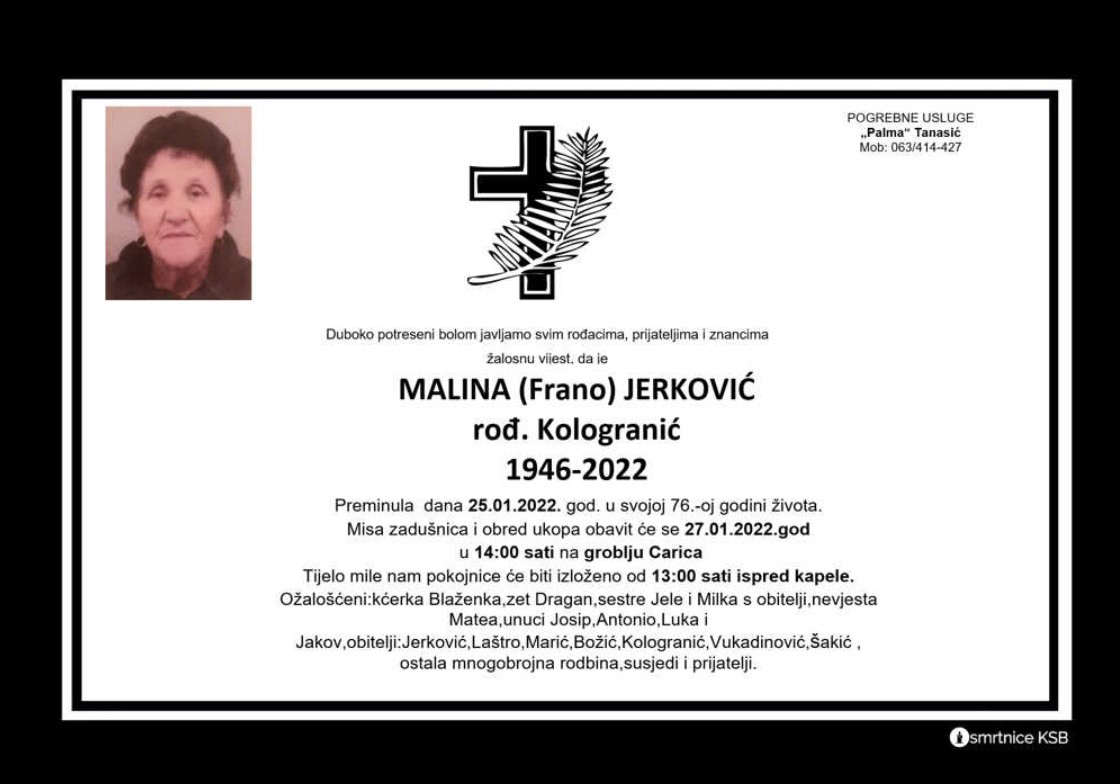 Malina (Frano) Jerković preminula dana 25. siječnja 2022. godine u svojoj 78-oj godini života. Misa zadušnica i obred ukopa obavit će se 27. siječnja u 14:00 sati na groblju Carica.