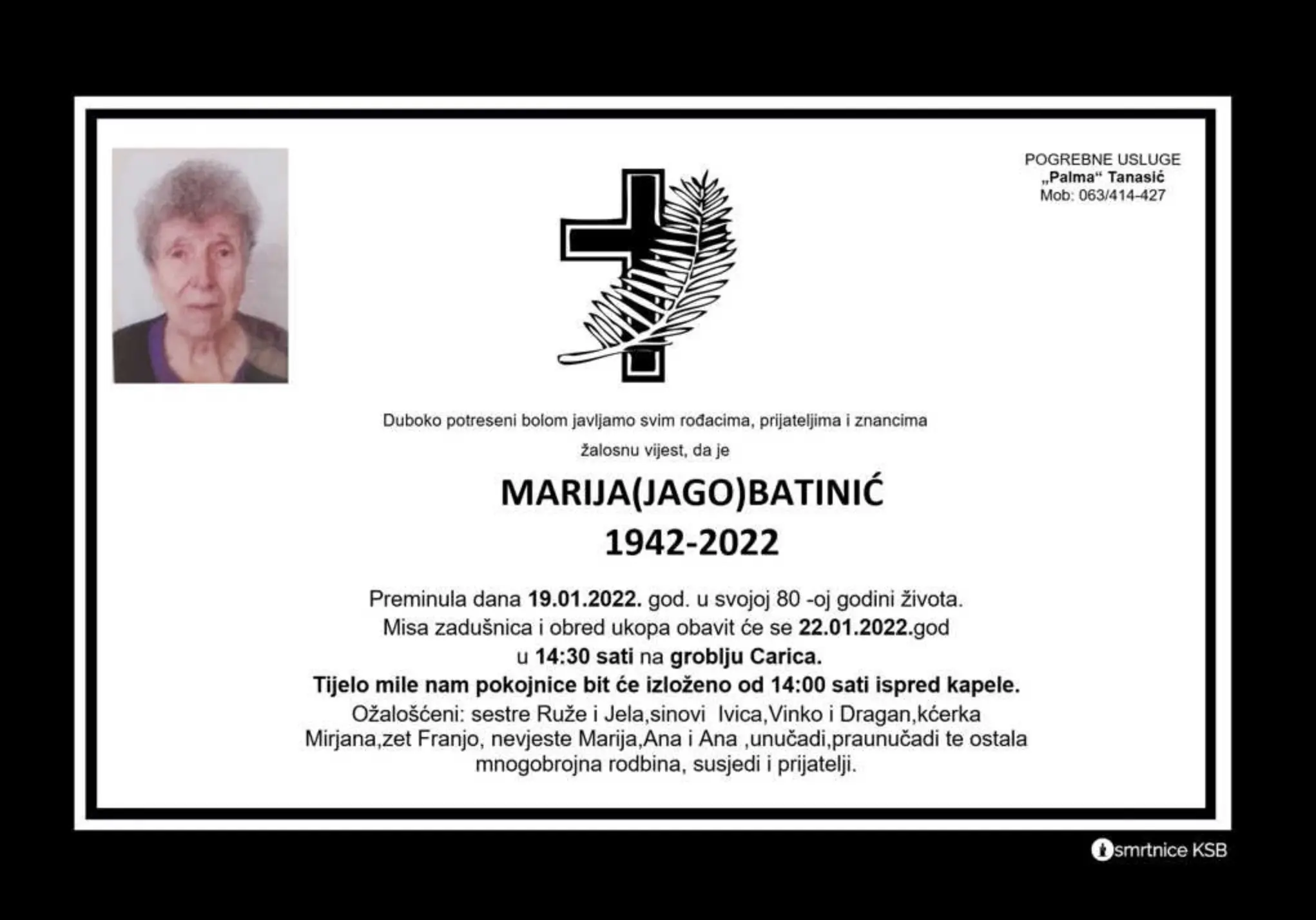 Misa zadušnica i obred ukopa obavit će se dana 22. siječnja 2022. godine u 14 i 30 sati na groblju Carica u Busovači.