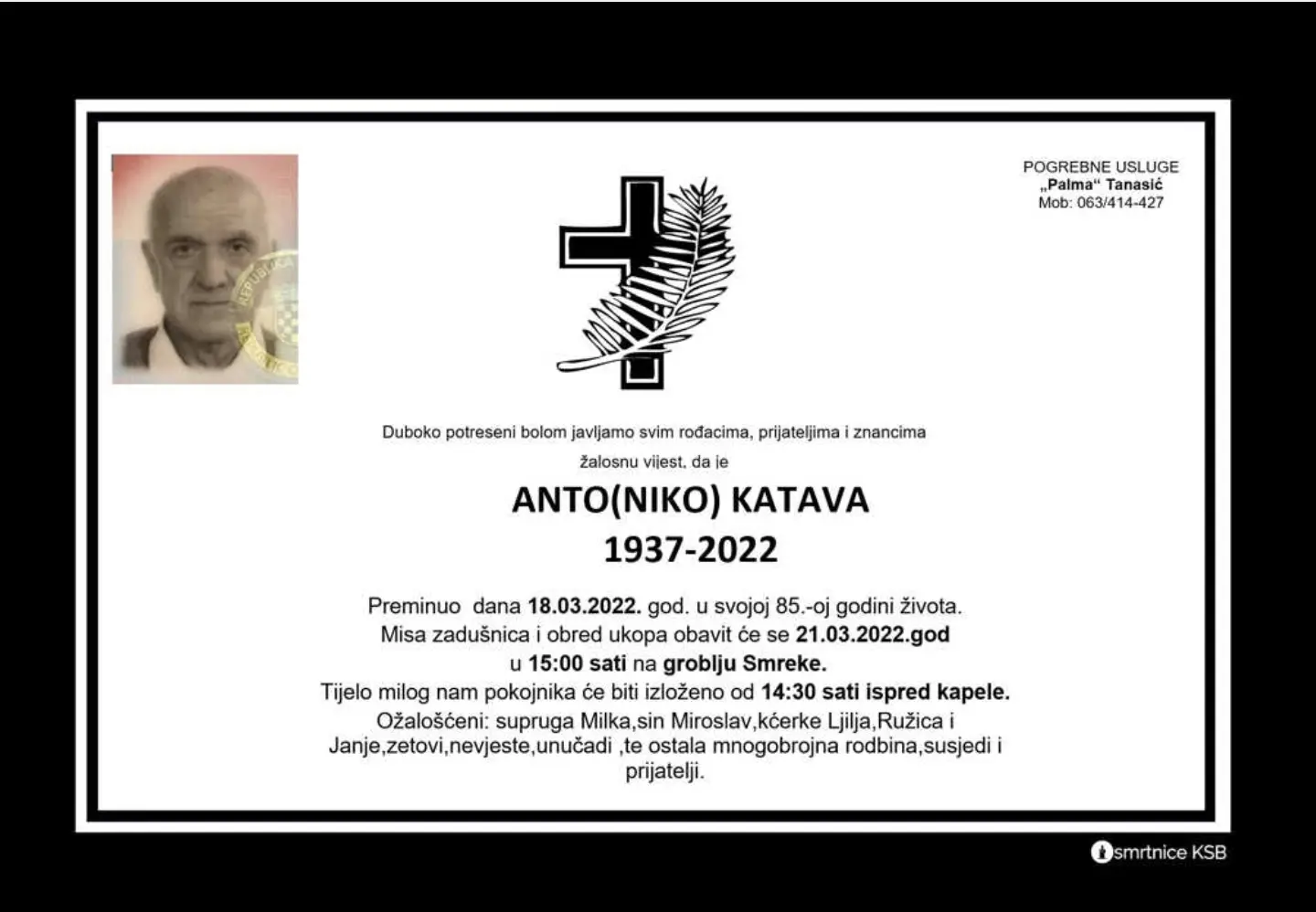 Anto (Niko) Katava preminuo je dana 18. 3. 2022. godine u svojoj 85. godini života. Misa zadušnica i obred ukopa obavit će se dana 21. 3. 2022. godine na groblju Smreke u 15:00 sati.