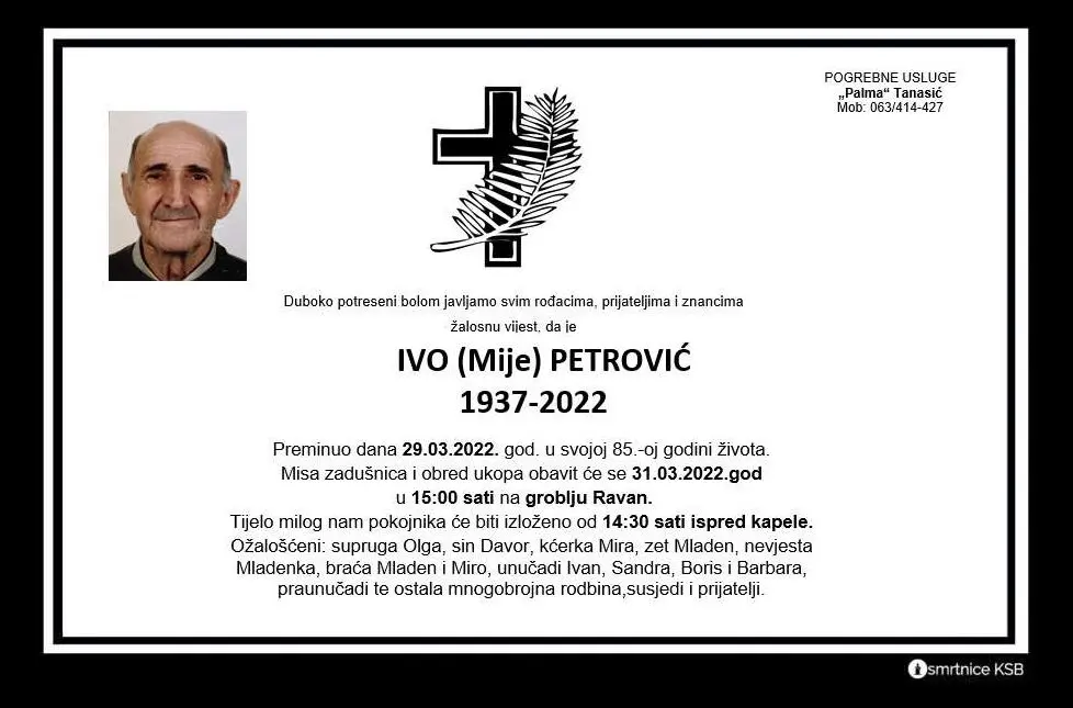29. ožujka u svojoj 85. godini života preminuo je Ivo Petrović. Misa zadušnica i obred ukopa obavit će se 31. ožujka u 15:00 sati na groblju Ravan.