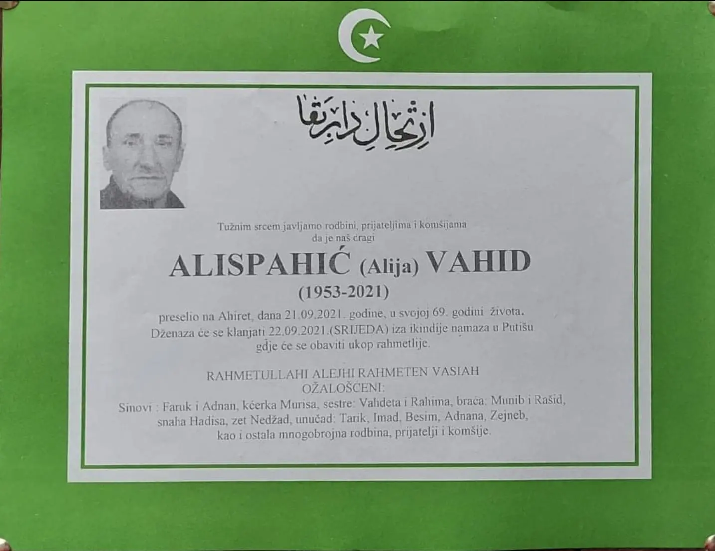21. rujna 2021. preminuo je Vahid Alispahić u svojoj 69. godini života.