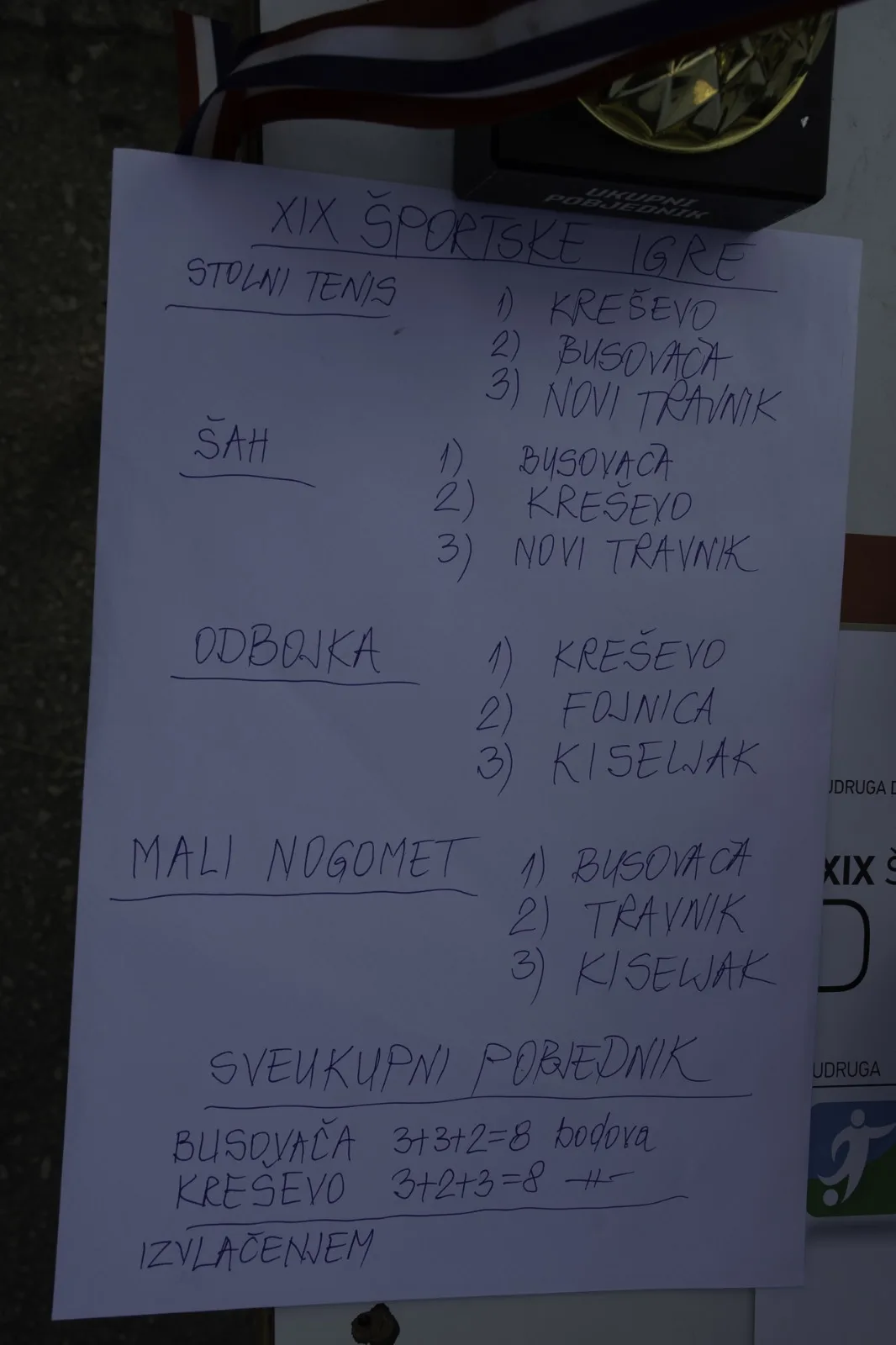 Sveukupni poredak rezultirao je izjednačenjem bodova između Busovače i Kreševa, no Busovača je izvlačenjem proglašena ukupnim pobjednikom XIX. Sportskih igara. Ovim rezultatom Busovača je još jednom pokazala svoju snagu i zajedništvo, istaknuvši se među brojnim ekipama koje su sudjelovale na ovom događaju.