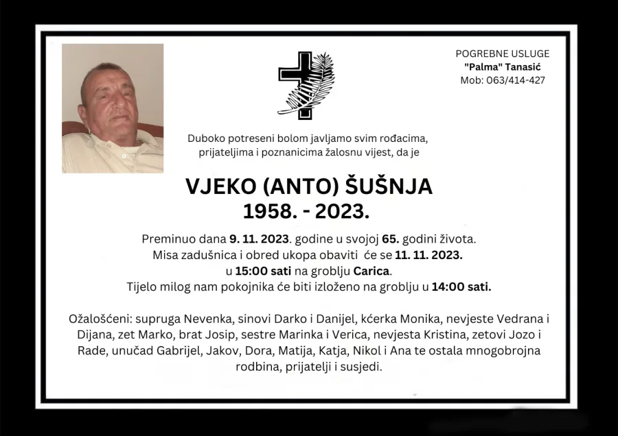 Duboko potreseni bolom javljamo svim rođacima, prijateljima i poznanicima žalosnu vijest, da je VJEKO (ANTO) ŠUŠNJA preminuo dana 9. 11. 2023. godine u svojoj 65. godini života.