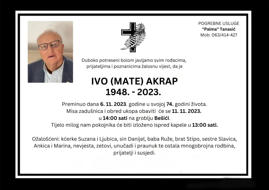 Duboko potreseni bolom javljamo svim rođacima, prijateljima i poznanicima žalosnu vijest, da je IVO (MATE) AKRAP preminuo dana 6. 11. 2023. godine u svojoj 74. godini života.