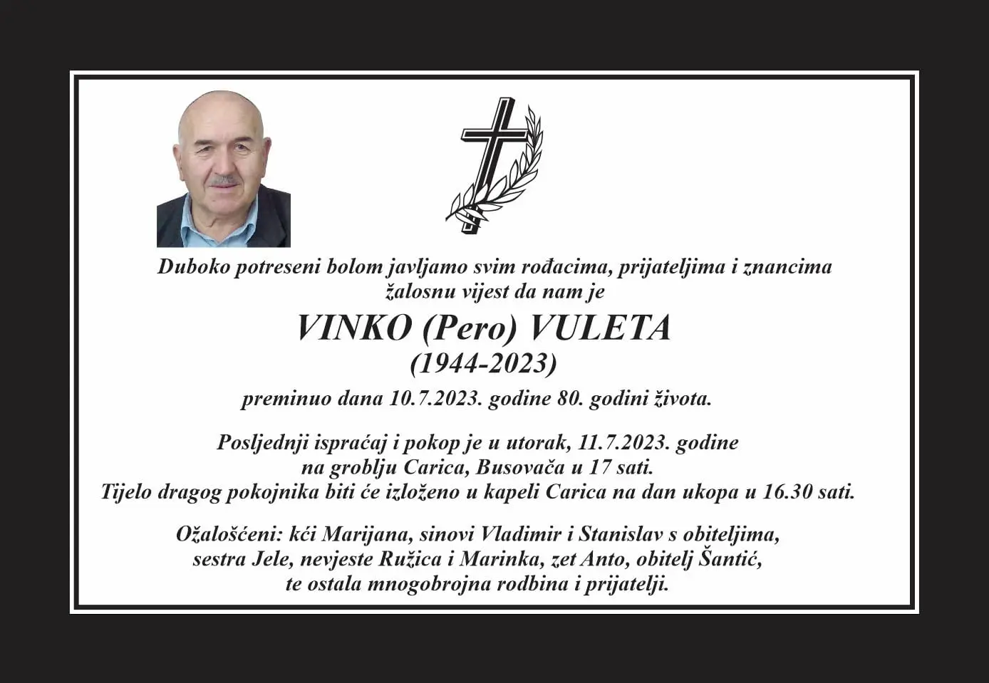 Duboko potreseni bolom javljamo svim rođacima, prijateljima i znancima žalosnu vijest da nam je Vinko (Pero) Vuleta preminuo dana 10. srpnja 2023. godine u 80. godini života.