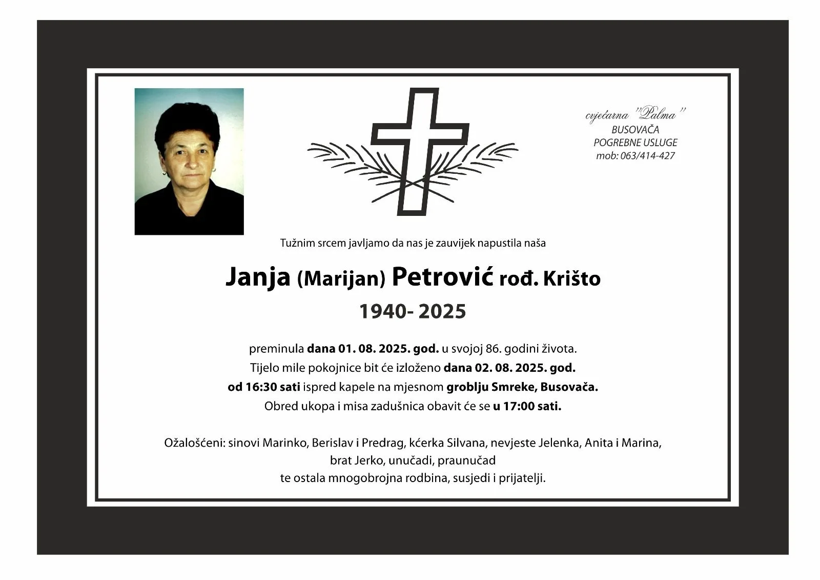Duboko potreseni bolom javljamo da nas je zauvijek napustila naša Janja (Marijan) Petrović rođena Krišto preminula dana 1. 8. 2025. godine u svojoj 86. godini života.