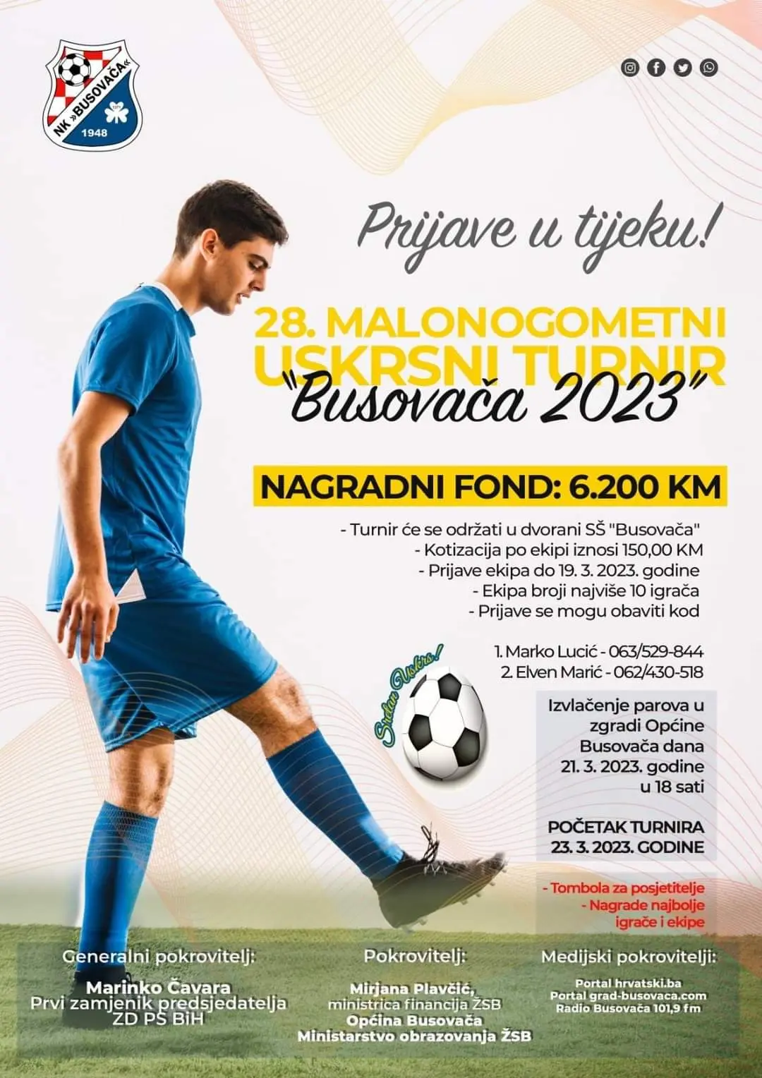 U Busovači uskoro počinje Uskrsni turnir u malom nogometu. Svoje ekipe možete prijaviti do 20. ožujka kada je i izvlačenje u sali zgrade Općine Busovača. Izvlačenje počinje u 17:30 sati.
