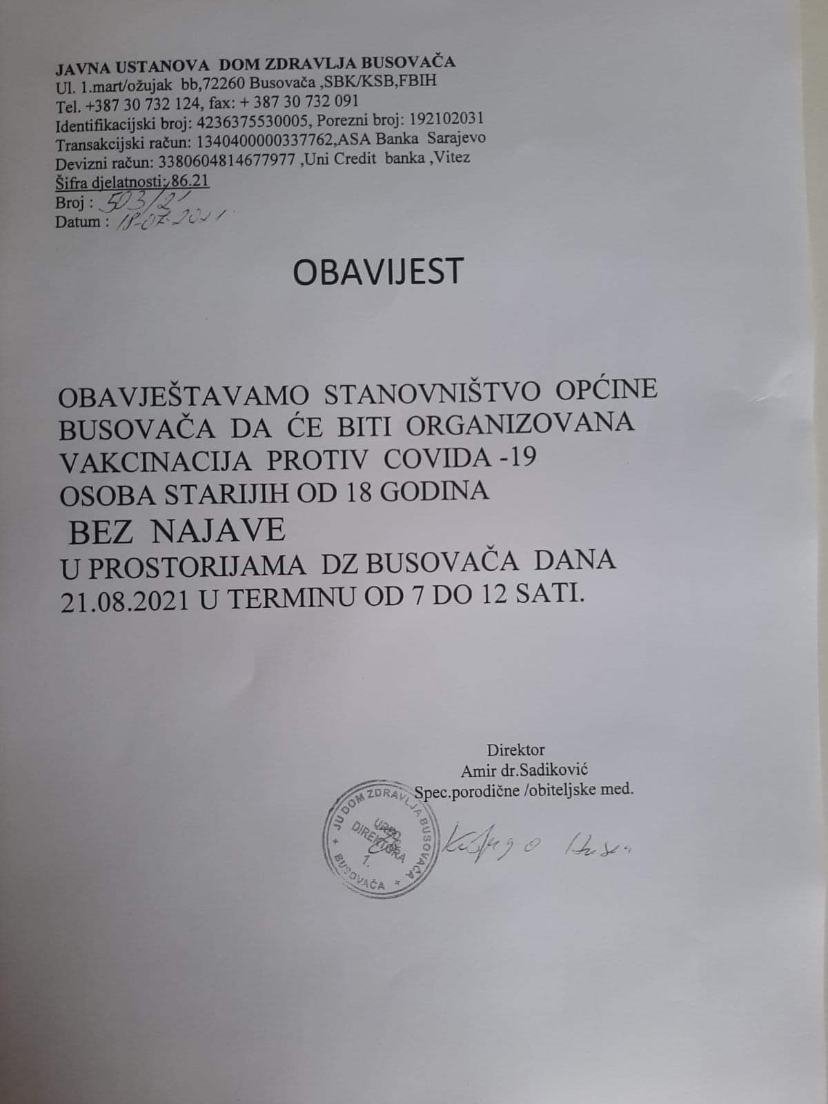 Javna ustanova Dom Zdravlja “Busovača” obavještava stanovništvo općine Busovača da će od 21. kolovoza, u prostorijama DZ Busovača biti organizirana vakcinacija protiv Covida 19 bez najave.