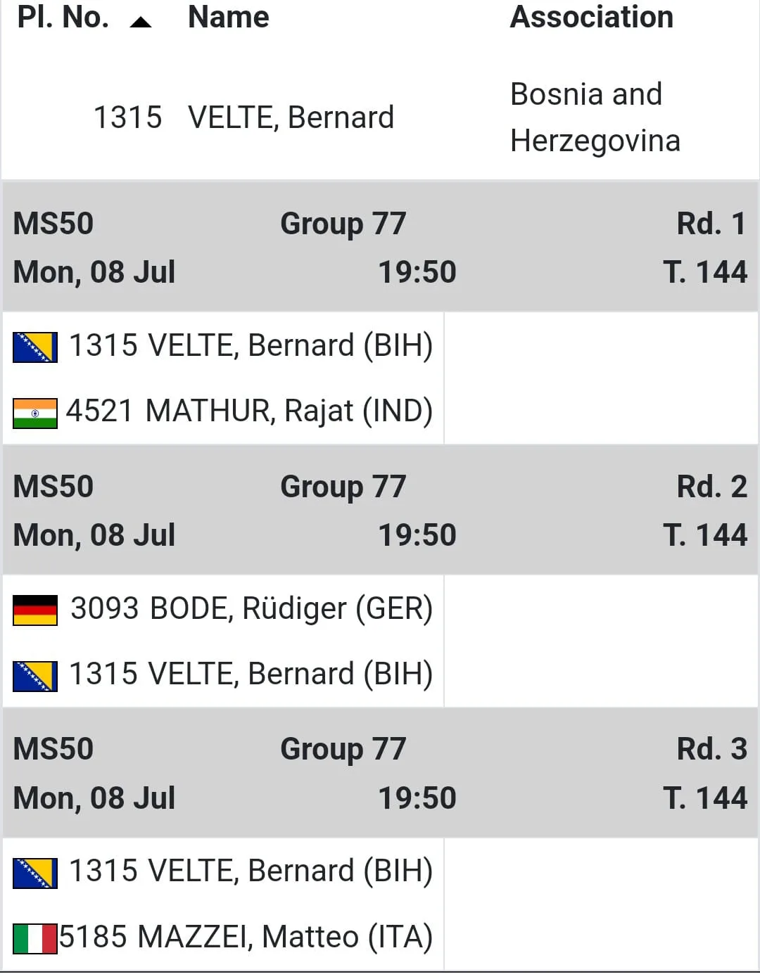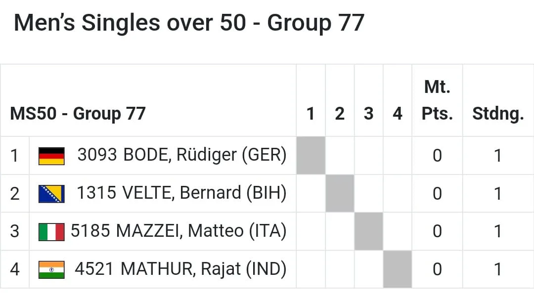Bernard Velte će se natjecati u kategoriji od 50 do 54 godine, jednoj od mnogih koje obuhvaćaju dobne skupine od 40 do 95 godina. “77. sam grupa od 167 grupa u mojoj kategoriji. Tijekom prvih susreta igrat ću protiv Njemca, Italijana te Indijca. Nakon grupne faze, ovisno o rezultatu, nastupam u turnirskom dijelu u grupi A ili B“, izjavio je Bernard Velte za grad-busovaca.com portal.