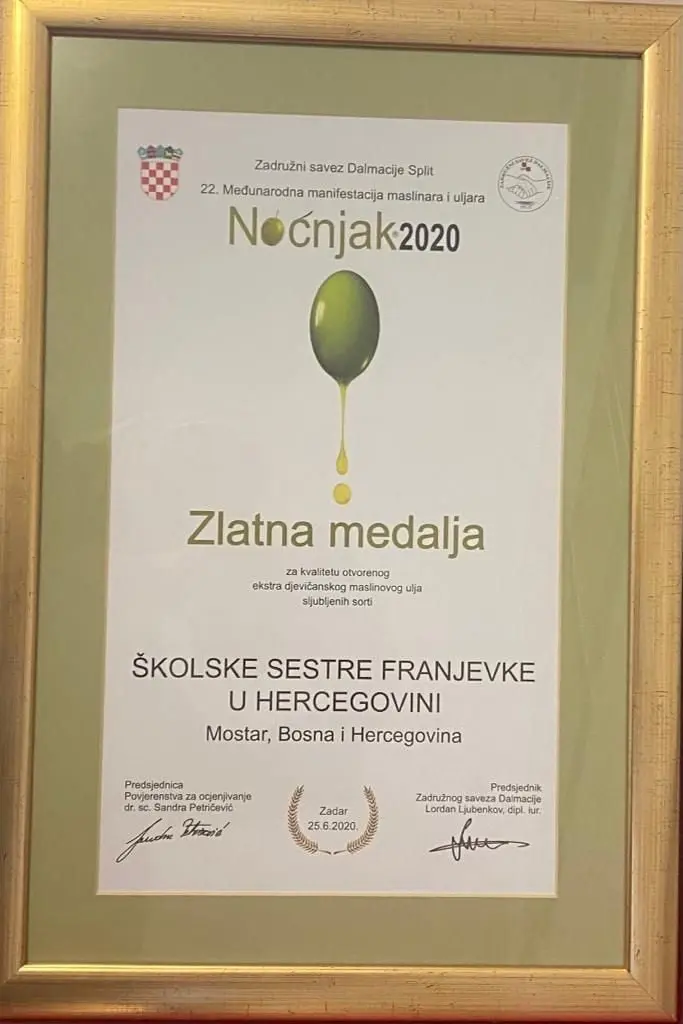 Posjed za maslinike u nasljedstvo je časnim sestrama ostavio pokojni biskup Paškal Buconjić. U maslinarstvo su kasnije ušle sasvim slučajno, a 2020. godine na 22. Međunarodnoj manifestaciji maslinara i uljara Noćnjak 2020. ove sestre franjevke su primile zlatnu plaketu koju im je dodijelio Zadružni savez Dalmacije za priznanje i kvalitetu maslinovog ulja, od plodova s ovog biblijskog stabla.