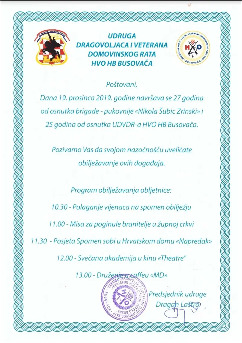 Danas će prigodnim programom biti obilježena 27. obljetnica osnutka brigade ‘Nikola Šubić Zrinski’ i 25. obljetnica osnutka Udruge dragovoljaca i veterana domovinskog rata HVO HB Busovača.