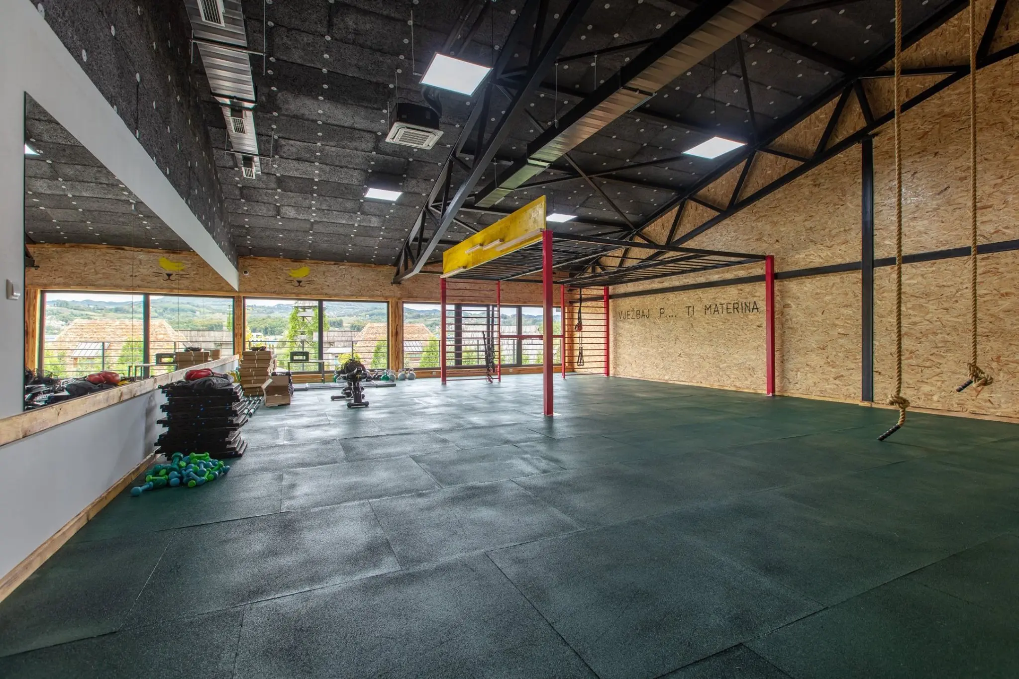 U interijeru koji prati dizajnersku priču etno sela dominiraju drvo i metal, a svaki dio prostora poštuje sadržaj kojemu je namijenjen. Moderni prostor osmišljen je u suradnji sa sportskim stručnjacima i trenerima, pa su u svakoj zoni postavljene sprave, oprema i podovi prilagođeni posebnim vrstama treninga.