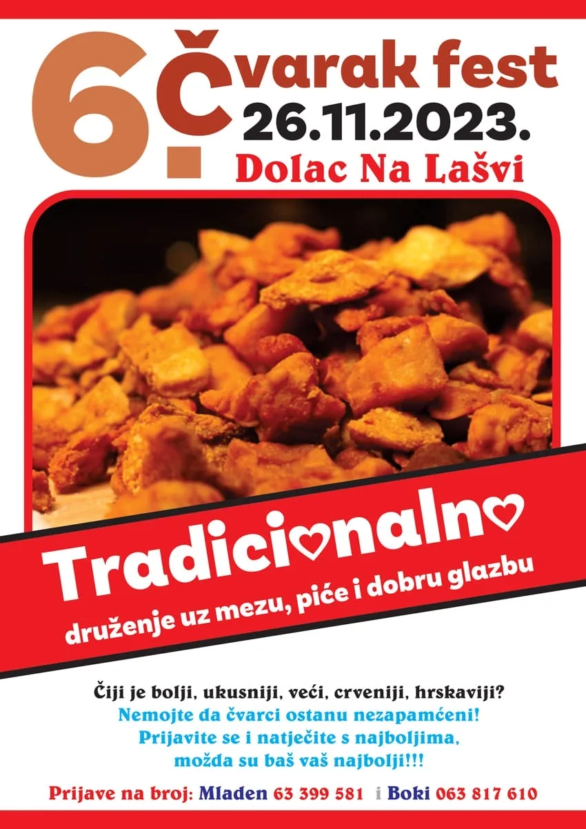 Gastro-zabavna manifestacija “Čvarak fest” i ove će godine biti organizirana na radost brojnih sudionika i posjetitelja. Prije šest godina, u organizaciji Mjesne zajednice Dolac, pokrenuta je manifestacija “Čvarak fest”, koja će ove godine, 26. studenog, biti organizirana šesti put.