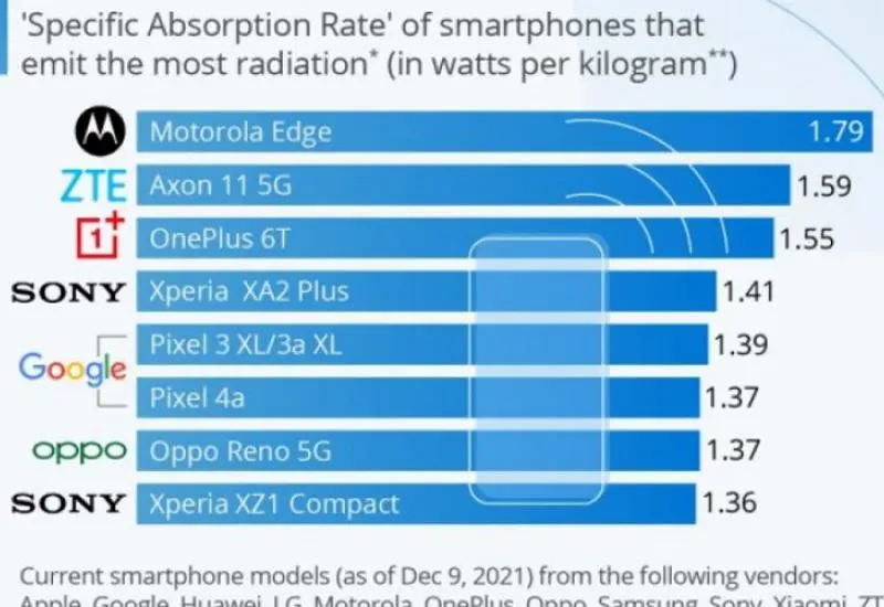 Trenutno telefon koji daleko najviše zrači je Motorola Edge. Nekada je iPhone bio na vrhu liste, ali je sada Apple promijenio to i nema ih ni u Top 10.