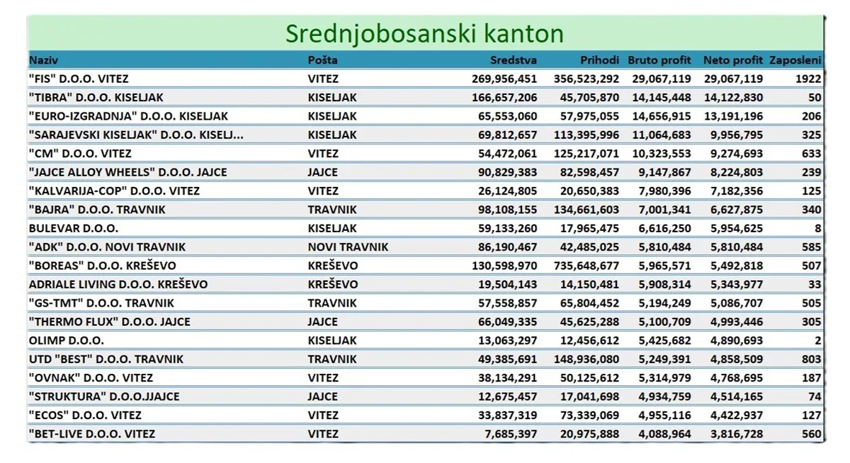 Na prvom mjestu najuspješnijih je „FIS“ d.o.o. Prošlogodišnja dobit ove tvrtke iznosila je 29.067.119 KM, a prihodi 356.523.292 KM. FIS zapošljava 1.922 radnika. Slijedi kompanije “Tibra“ iz Kiseljaka, koja djeluje u oblasti građevinarstva i visokogradnje s 50 zaposlenih. U 2023. godini imali su dobit od 14.122.830 KM, dok su prihodi bili 45.705.870 KM.