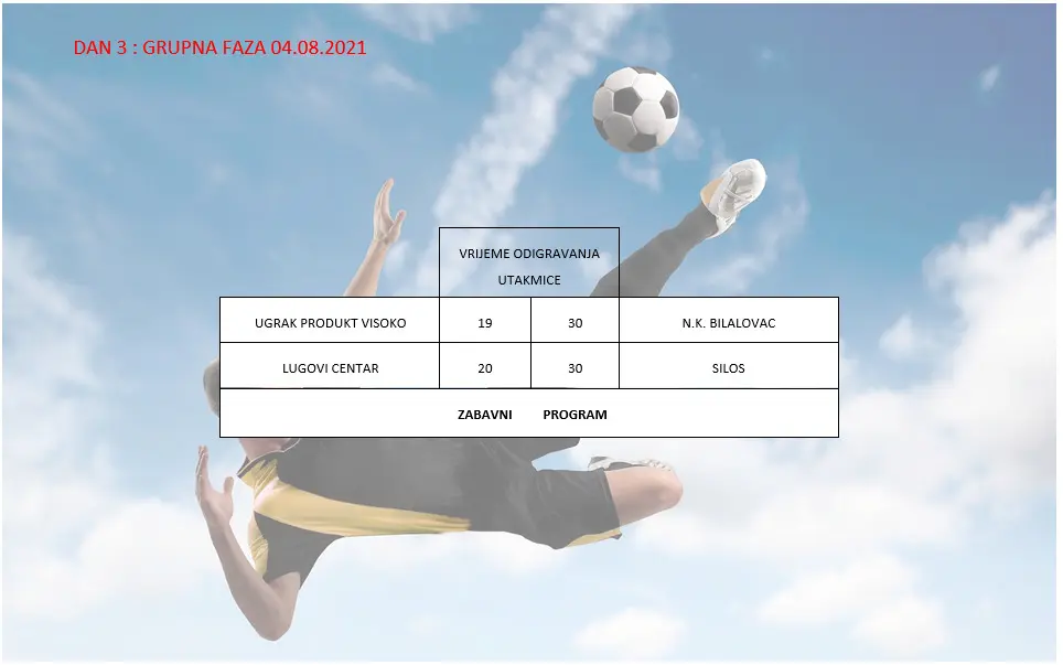 Večeras su utakmice 3. dana turnira, a igraju se u dva termina. U 19:30 Ugarak produkt iz Visokog i NK Bilalovac. U drugoj utakmici dana u 20:30 Lugovi centar protiv Silosa.