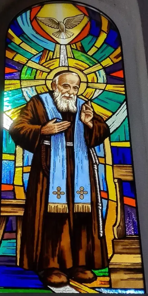 Na prolazu prema crkvenom koru postavljen je vitraj sv. Leopolda Mandića, ispovjednika. U prezbiteriju nalaze se dva visoka i uska vitraja, inicijali sv. Nikole Tavelića (NT), koji bojama i visinom dočaravaju njegovu mučeničku smrt i daleki put kojim se usmjerio prema istoku.