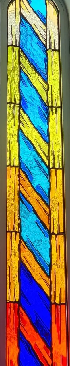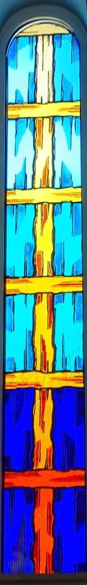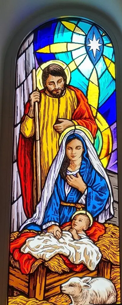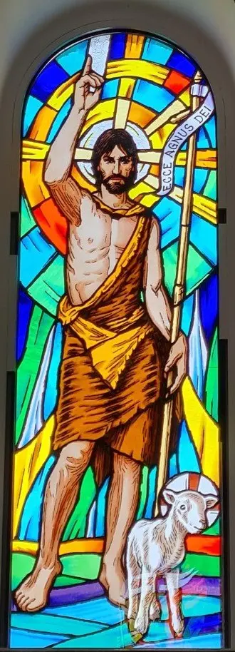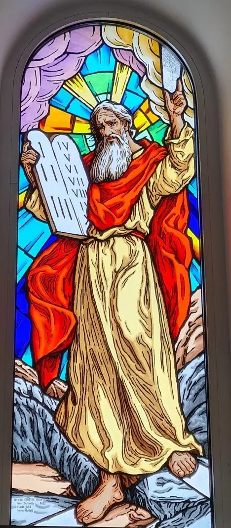 Ulaskom u crkvu s lijeve strane nalaze se vitraji na kojima su prikazani važniji događaji iz Staroga zavjeta. Na njima su predstavljeni Abraham koji žrtvuje svoga sina Izaka, Mojsije s Deset Božjih zapovijedi i sv. Ivan Krstitelj, koji za Isusa Krista kaže: „Evo Jaganjca Božjega“. S desne strane prikazani su važniji događaji iz Novoga zavjeta: Blažena Djevica Marija – Navještenje, Božić – Sveta Obitelj i Uskrsli Krist – Uskrsnuće.