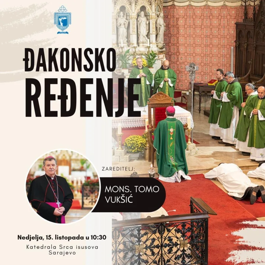 Vrhbosanski nadbiskup metropolit mons. Tomo Vukšić u nedjelju, 15. listopada u sarajevskoj katedrali Srca Isusova tijekom sv. mise u 10:30 za đakone će zarediti petoricu kandidata: dvojicu za Franjevačku provinciju Bosnu Srebrenu (fra Hrvoje Žabić i fra Danijel Lukić) i trojicu članova Neokatekumenskog puta za Vrhbosansku nadbiskupiju (Jesus Antonio Gazquez Hernandez, Mislav Anton Botica i Nilson Gerardo Andrade Ibarra).