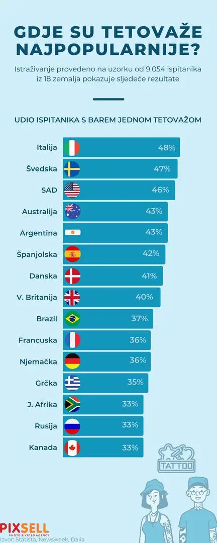 Infografika prikazuje gdje su tetovaže najpopularnije. Istraživanje je provedeno na uzorku od 9.054 ispitanika iz 18 zemalja i prikazuju kako su tetovaže najpopularnije u Italiji, Švedskoj i SAD-u.