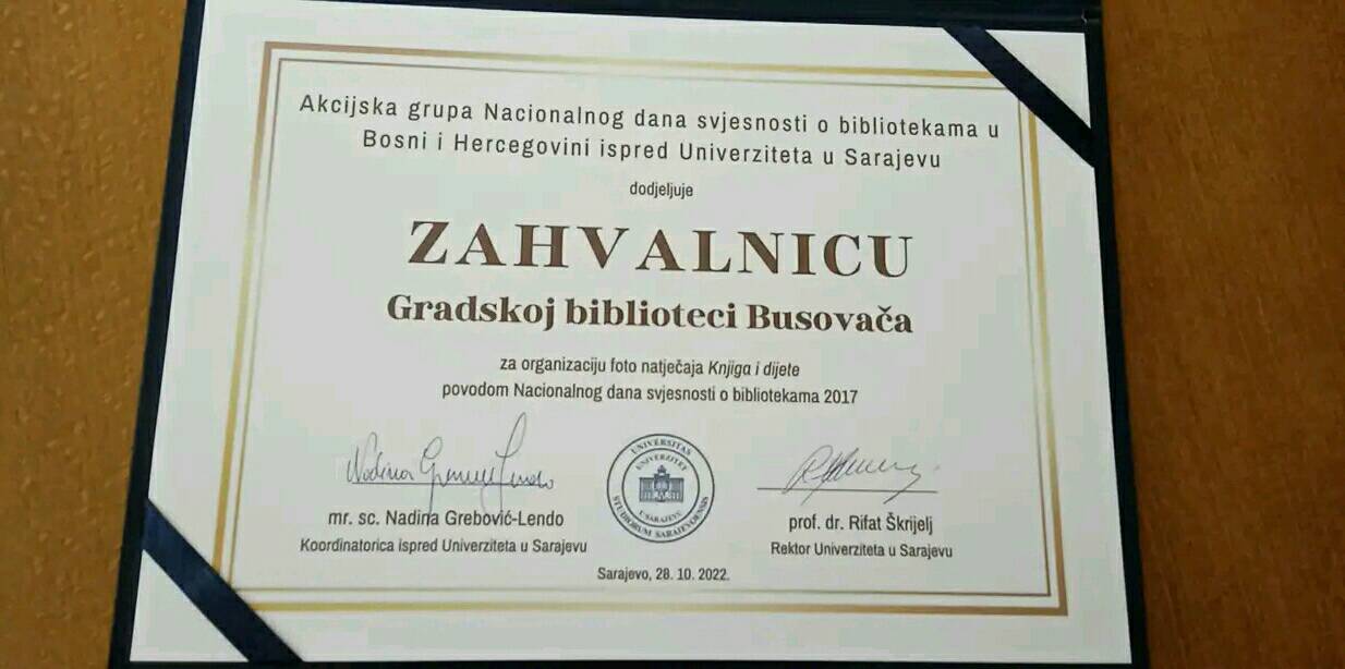 Gradska knjižnica Busovača dobila je zahvalnicu za organizaciju foto natječaja “Knjiga i dijete” povodom Nacionalnog dana svjesnosti o bibliotekama 2017. godine. Zahvalnicu je primila ravnateljica Gradske knjižnice Busovača Ankica Mravak! Čestitamo.