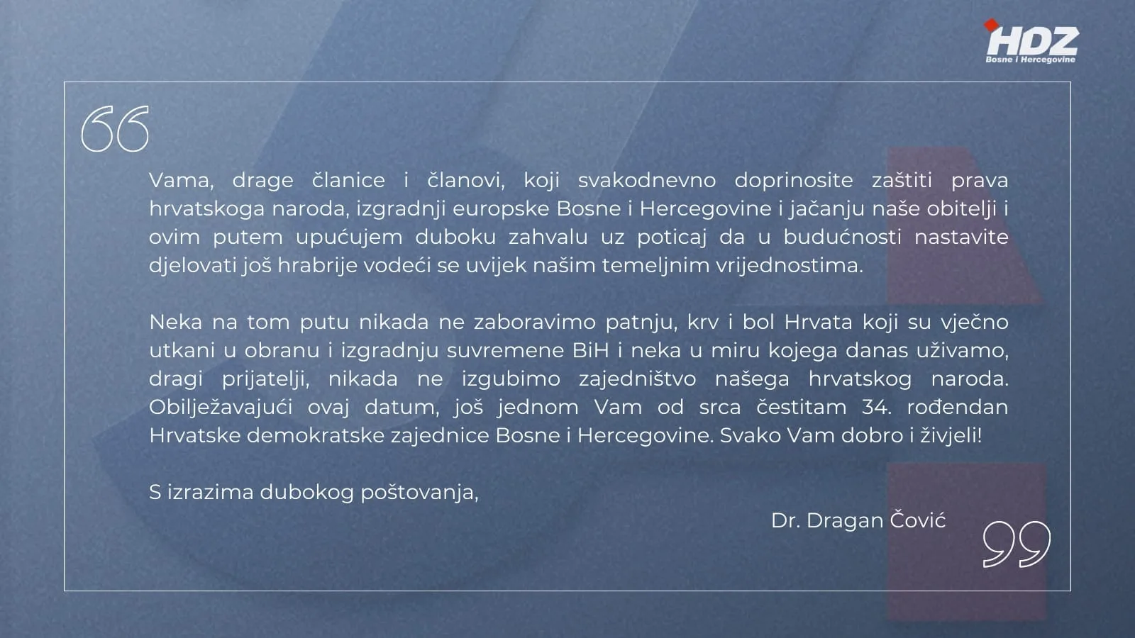 Svima Vama, drage članice i članovi, koji svakodnevno doprinosite zaštiti prava hrvatskoga naroda, izgradnji europske Bosne i Hercegovine i jačanju naše obitelji i ovim putem upućujem duboku zahvalu uz poticaj da u budućnosti nastavite djelovati još hrabrije vodeći se uvijek našim temeljnim vrijednostima.