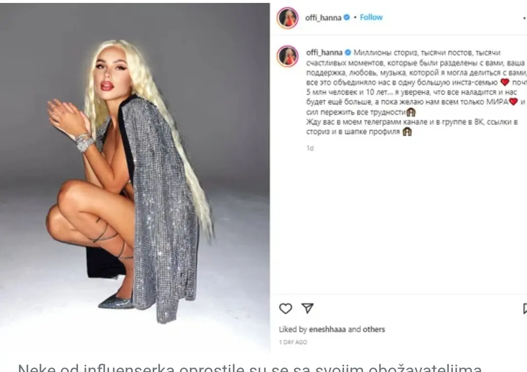 Još neke od ruskih influenserki reagirale su na gašenje Instagrama, a putem profila oprostile su se sa svojim obožavateljima te ih pozvali da im se pridruže na Telegramu i VKontaktu – ruskom ekvivalentu Facebooka.