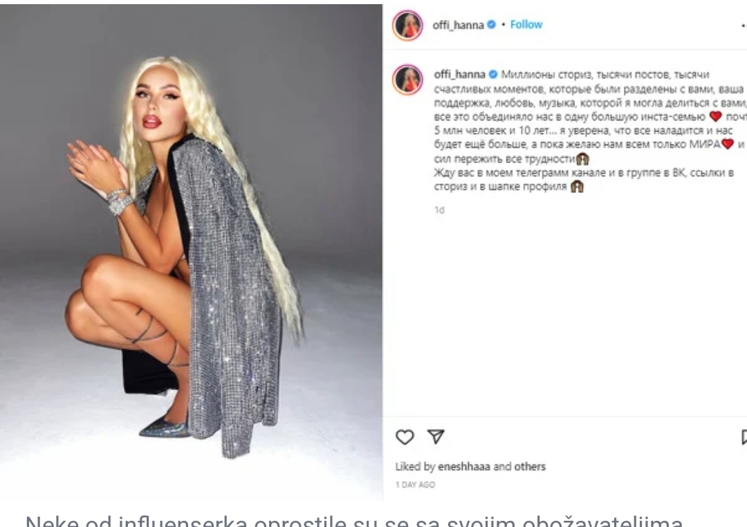Još neke od ruskih influenserki reagirale su na gašenje Instagrama, a putem profila oprostile su se sa svojim obožavateljima te ih pozvali da im se pridruže na Telegramu i VKontaktu – ruskom ekvivalentu Facebooka.