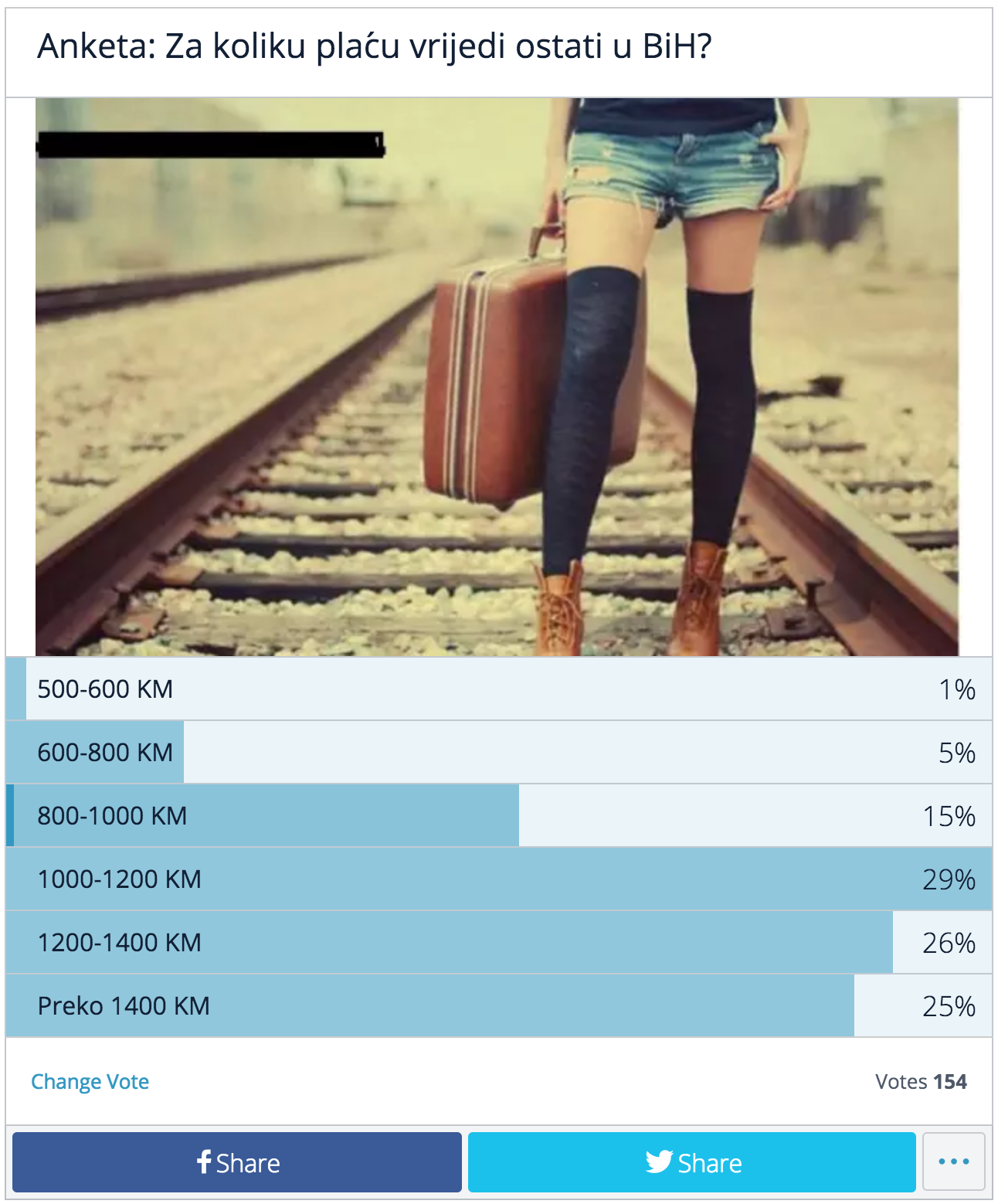 Tim povodom odlučili smo uraditi anketu na grad-busovaca.com portalu i pitati čitatelje za koliku plaću vrijedi ostati u BiH. Najviše ispitanika je reklo da bi plaća od 1000 do 1200 KM bila dostojna za život u Bosni i Hercegovini, odnosno 80% ispitanika je kazalo da je plaća veća od 1000 KM dovoljna za pristojan život u BiH i da je taj iznos plaće garancija ostanka u BiH. Preostalih 20% kazalo je da je dovoljno od 600 do 1000 KM. Ukoliko pogledamo prosječne neto plaće po djelatnostima, stanje je sljedeće: