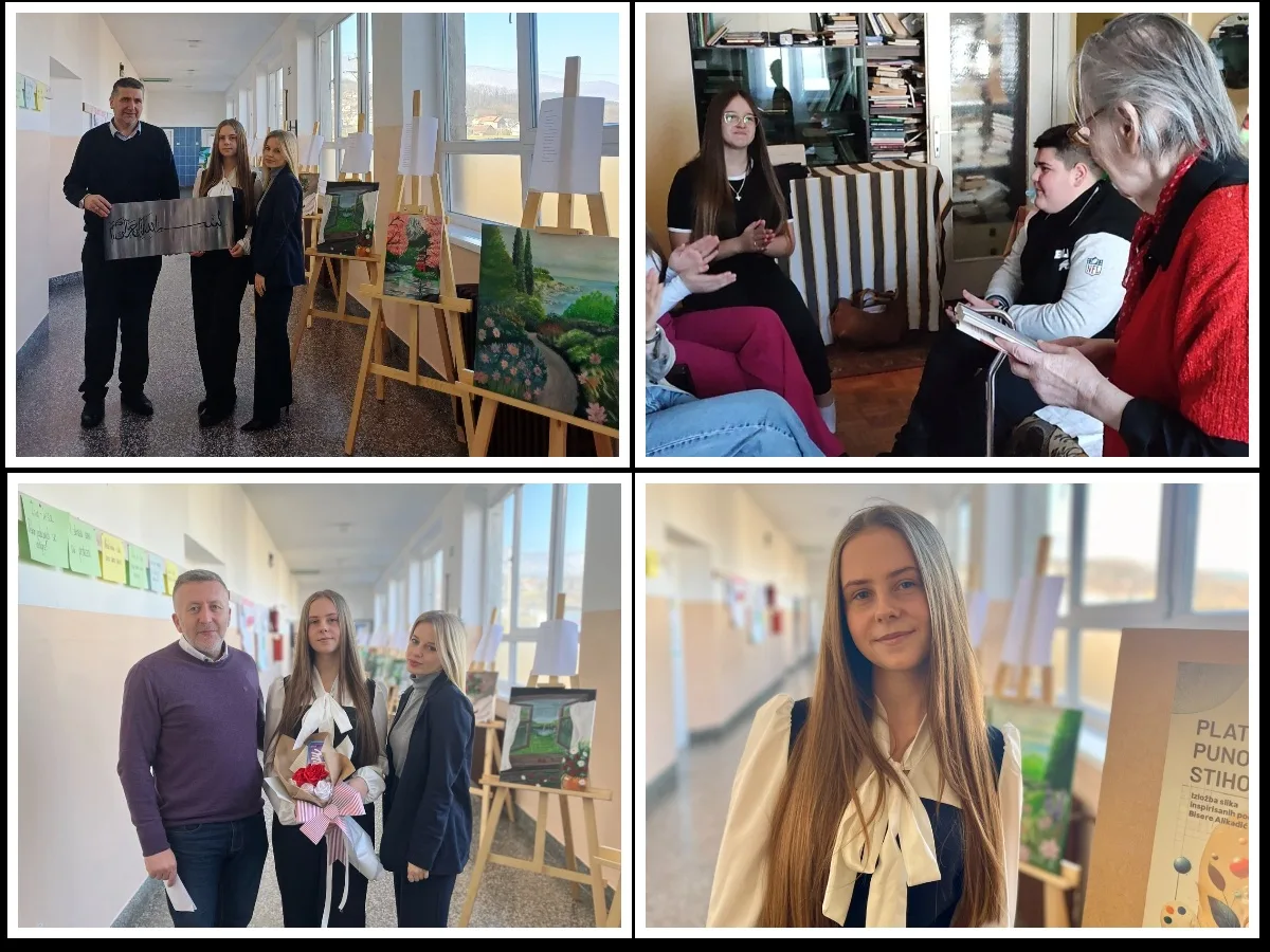 Učenica devetog razreda, Aldijana Šljivar, svojim je talentiranim rukopisom uspjela pretočiti emocije pjesničkih stihova u slikarske radove, stvarajući snažnu vezu između likovne umjetnosti i poezije. Njezine slike privukle su veliku pozornost i izazvale oduševljenje prisutnih. Uz njezine radove, učenici iz razreda 9-2 svojim su recitacijama pjesama koje su inspirirale slike dodatno obogatili ovaj događaj, naglašavajući ljepotu materinjeg jezika i umjetnosti. Ovaj poseban trenutak podržala je Bošnjačka zajednica kulture, općinsko društvo Kiseljak, koja je istaknula važnost ovakvih inicijativa za očuvanje kulturnog identiteta.