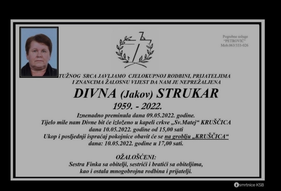 Preminula je Divna Strukar, osoba koja je radila na protokolu bolnice.Posljednji ispračaj bit će sutra u 17 sati na groblju Kruščica u Vitezu, javlja Centralna.