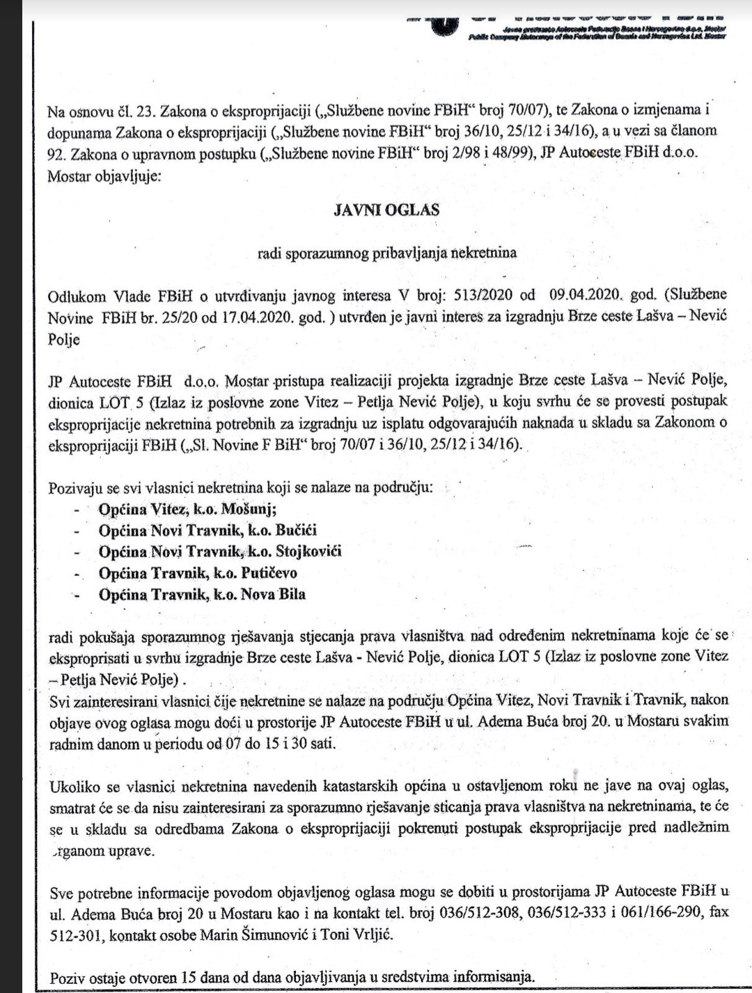Javno podizeće Autoceste FBIH Mostar pozivaju vlasnike nekretnina i zemljišta sa područna općina Vitez, Novi Travnik i Travnik da se jave zbog sporazumnog dogovora oko stjecanja prava vlasništva zemljišta.
