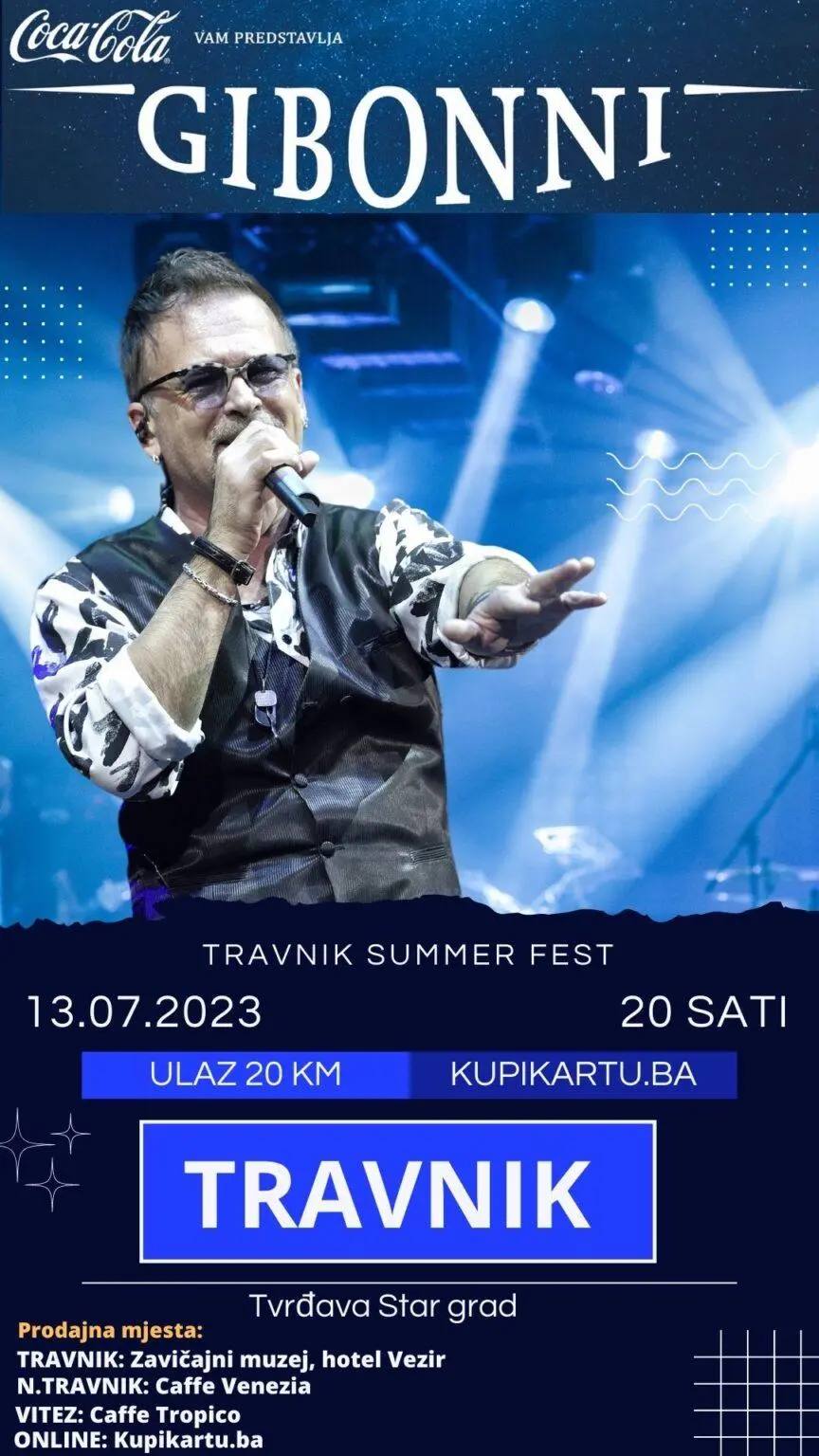 Točno deset dana ostalo je do koncerta regionalne zvijezde Gibonnija na tvrđavi Stari grad u Travniku. Koncert će se održati u četvrtak 13.07. Od 20 sati u sklopu manifestacije Travnik Summer Fest, a vrata tvrđave otvaraju se od 19:00.