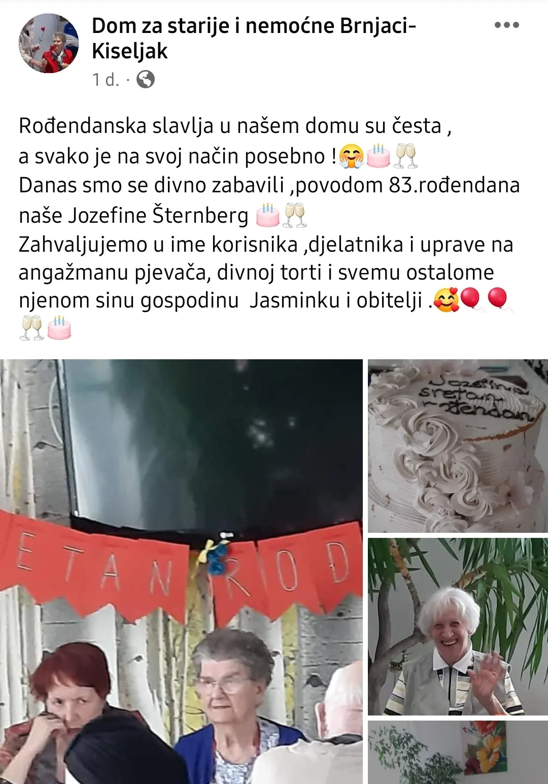 Jozefina Štenberg proslavila je 83. rođendan, a sin Jasminko organizirao je pjevača i tortu kako bi uveličao ovaj događaj, na čemu su mu se zahvalili svi korisnici i djelatnici uprave: