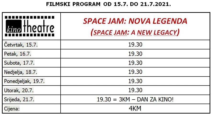 Od četvrtka, 15.7., u kinu „Theatre“ pogledajte film „Space Jam: Nova legenda“ u kojem NBA prvak i globalna ikona LeBron James kreće u epsku avanturu zajedno s bezvremenskim Looney Tunes likovima.