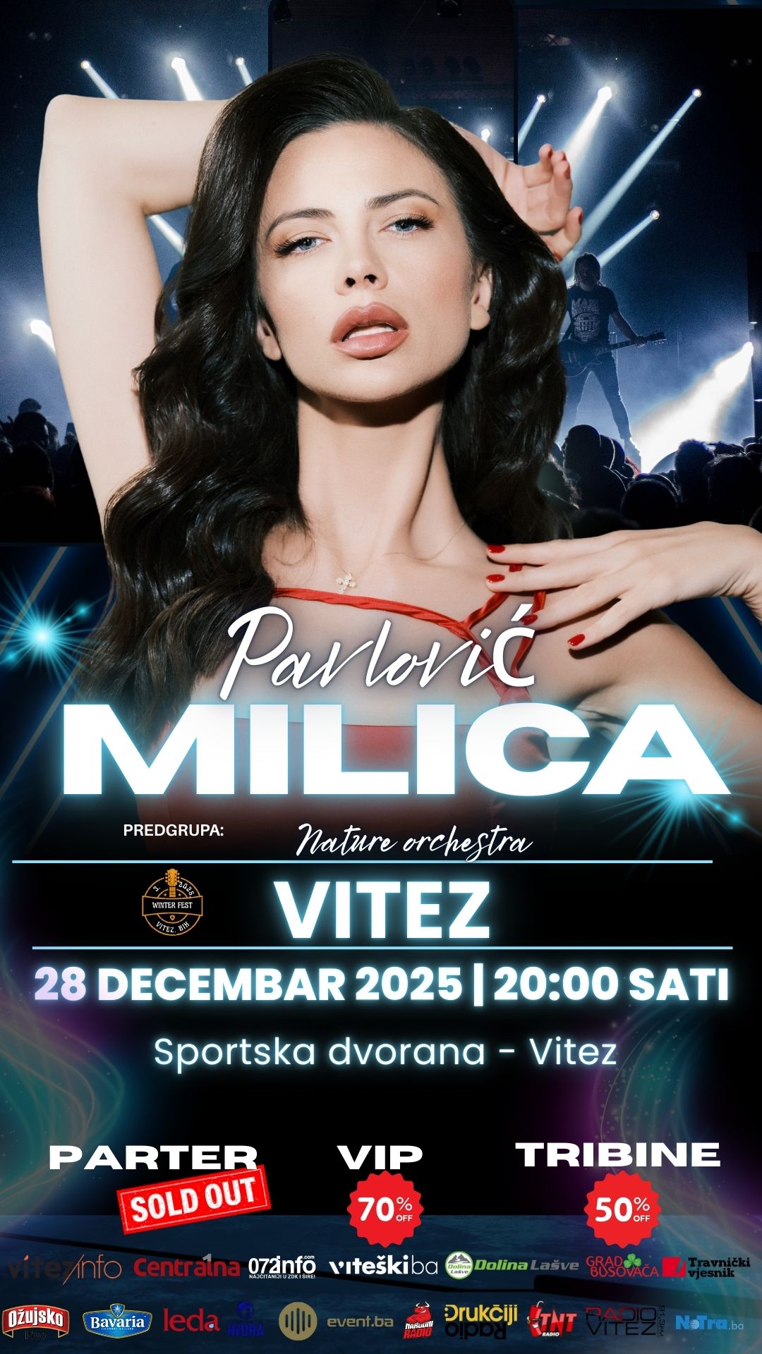 Jedna od najvećih regionalnih muzičkih zvijezda, Milica Pavlović, održat će spektakularni koncert u Gradskoj sportskoj dvorani Vitez u nedjelju, 28.decembra 2025. godine, s početkom u 20:00 sati. Ovaj dugo iščekivani muzičko-scenski događaj već sada izaziva ogromno interesovanje publike, što potvrđuje i činjenica da su ulaznice za parter u potpunosti rasprodane. Uvertira u nastup bit će sjajna i omiljena Nature orchestra, koju publika jednostavno obožava.