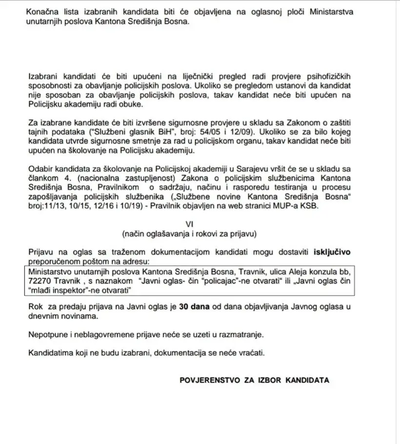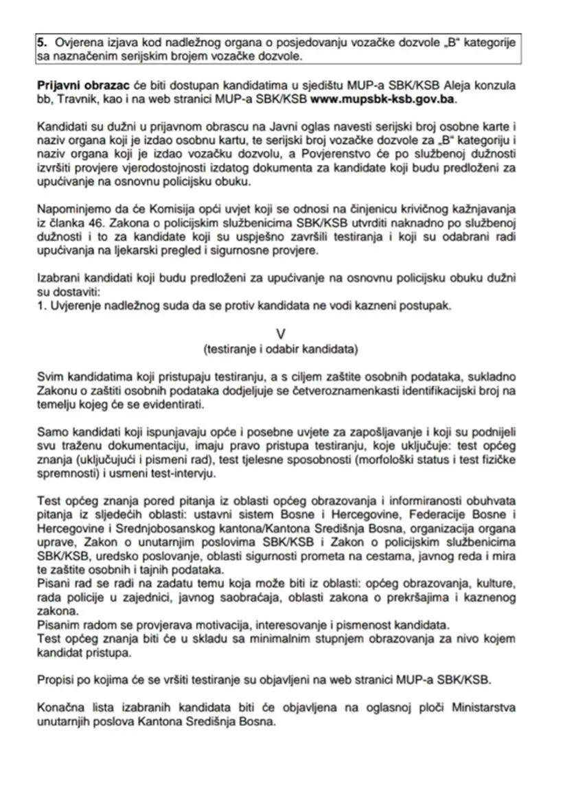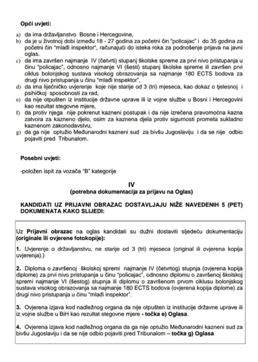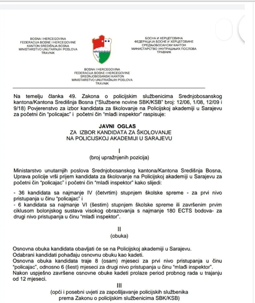 MUP KSB u potrazi je za 36 policajaca i 6 mlađih inspektora. Prenosimo oglas u cijelosti: