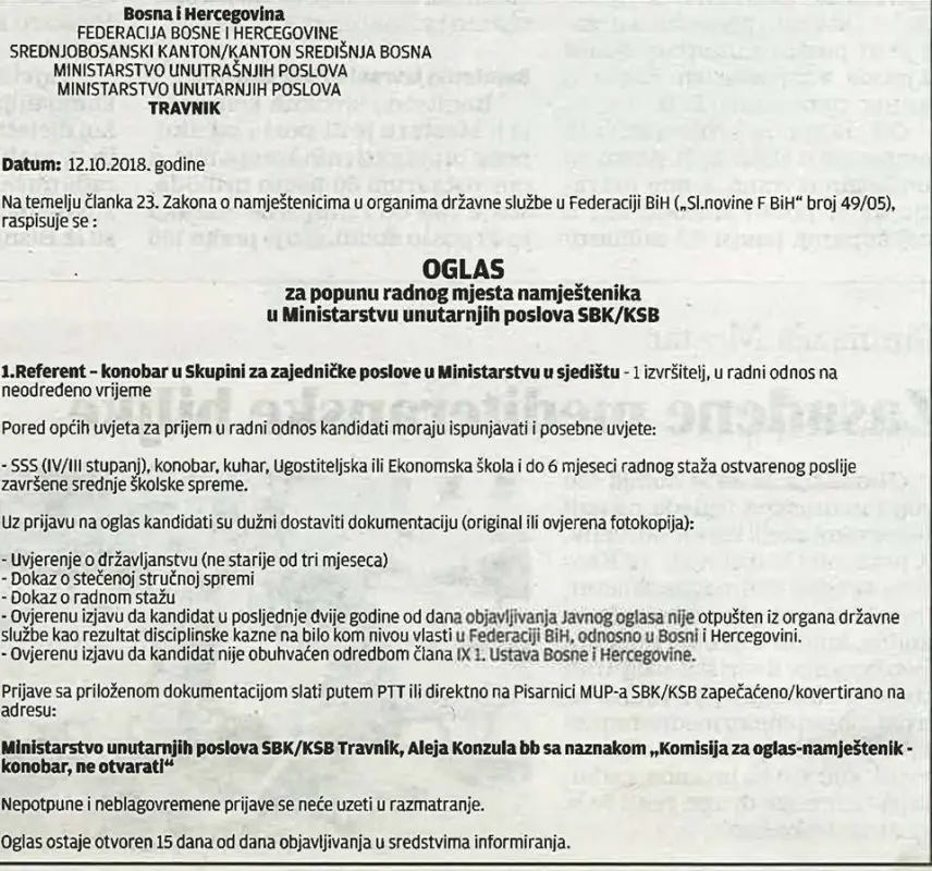 Ministarstvu unutrašnjih poslova SBK/KSB potreban referent – konobar u Skupini za zajedničke poslove u Ministarstvu u sjedištu.