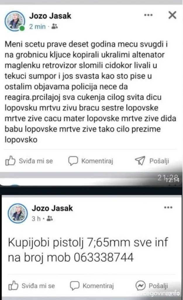 “Vezano za Vaše upite od dana 30.08.2022. godine obavještavamo vas da osobe Jozo Jasak, rođen 1972. godine i Draženko Jasak, rođen 1969. godine (braća), stalno nastanjeni u mjestu Sovići, općina Grude, su evidentirani u službenim evidencijama Policijske uprave Grude. Protiv Draženka Jasaka su od strane policijskih službenika PU Grude upućena četiri izvješća o počinjenom kaznenom djelu Županijskom tužiteljstvu Županije Zapadnohercegovačke u Širokom Brijegu zbog osnova sumnje da je počinio više kaznenih djela iz čl. 183. KZ F BiH Ugrožavanje sigurnosti, i to u vremenskom razdoblju od 2019. do 2022. godine. Za sva navedena kaznena djela Županijsko tužiteljstvo Županije Zapadnohercegovačke u Širokom Brijegu je donijelo nalog o provođenju istrage. Također, protiv Joze Jasaka je od strane policijskih službenika PU Grude dva puta podnijeto Izvješće o počinjenom kaznenom djelu Županijskom tužiteljstvu ŽZH, zbog osnova sumnje da je isti počinio kaznena djela iz čl. 293. St.1 KZ F BiH oštećenje tuđe stvari”, naveli su.