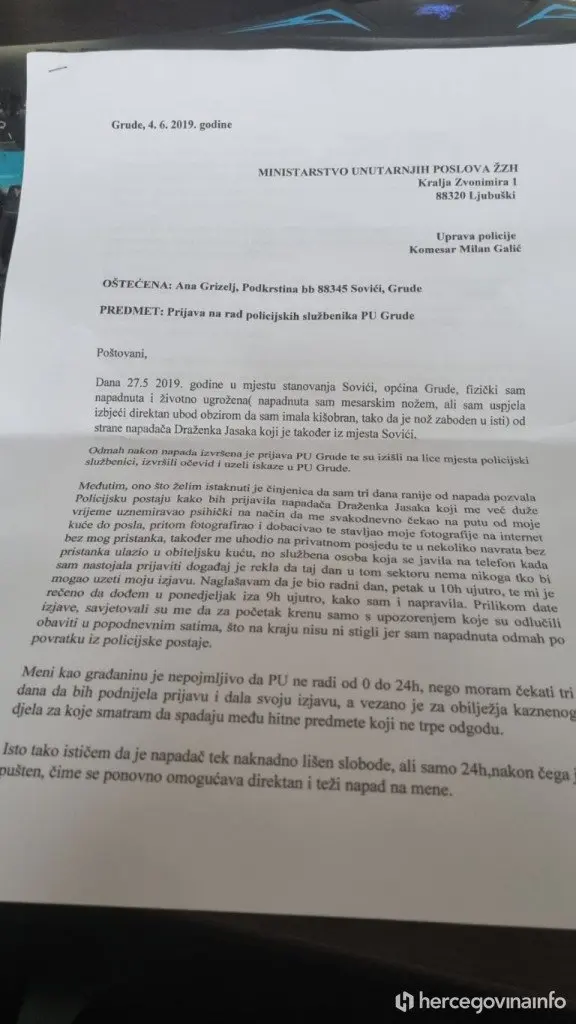 “Vezano za Vaš upit o prijetnji susjedima, napadu nožem, bacanju bombe i podmetanju požara, možemo reći da je PU Grude 2019. godine zaprimila prijavu da je u mjestu Sovići, op. Grude, osoba A.G. iz mjesta Sovići, napadnuta nožem od strane Draženka Jasaka kojom prilikom nije zadobila tjelesne ozljede. Zbog osnova sumnje u počinjenje kaznenog djela iz čl.183 KZ F BiH ugrožavanje sigurnosti je od strane policijskih službenika PU Grude protiv imenovanog Draženka Jasaka upućeno izvješće o počinjenom kaznenom djelu Županijskom tužiteljstvu ŽZH koji su donijeli nalog o provođenju istrage. Također, u PU Grude je evidentirano da je imenovani Draženko Jasak i 2022. godine gore imenovanoj A.G. uputio verbalne prijetnje po život zbog čega su policijski službenici PU Grude protiv istog uputili izvješće o počinjenom kaznenom djelu iz čl.183 KZ FBiH ugrožavanje sigurnosti Županijskom tužiteljstvu ŽZH, a na što je Županijsko tužiteljstvo donijelo nalog o provođenju istrage”, istaknuli su iz MUP-a ŽZH.