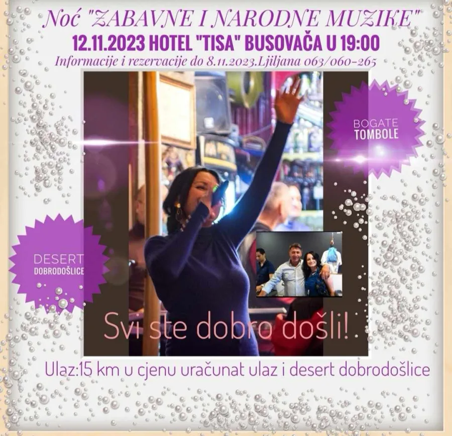 Nakon velikog uspjeha prve “Noći zabavne i narodne muzike”, organizatorica Ljiljana Milanović, poznata kao Ljiljana Elegant, priprema novo nezaboravno glazbeno putovanje i večer. Ova nezaobilazna zabava održat će se 12. 11. 2023. godine u hotelu “Tisa” u Busovači, s početkom u 19 sati.