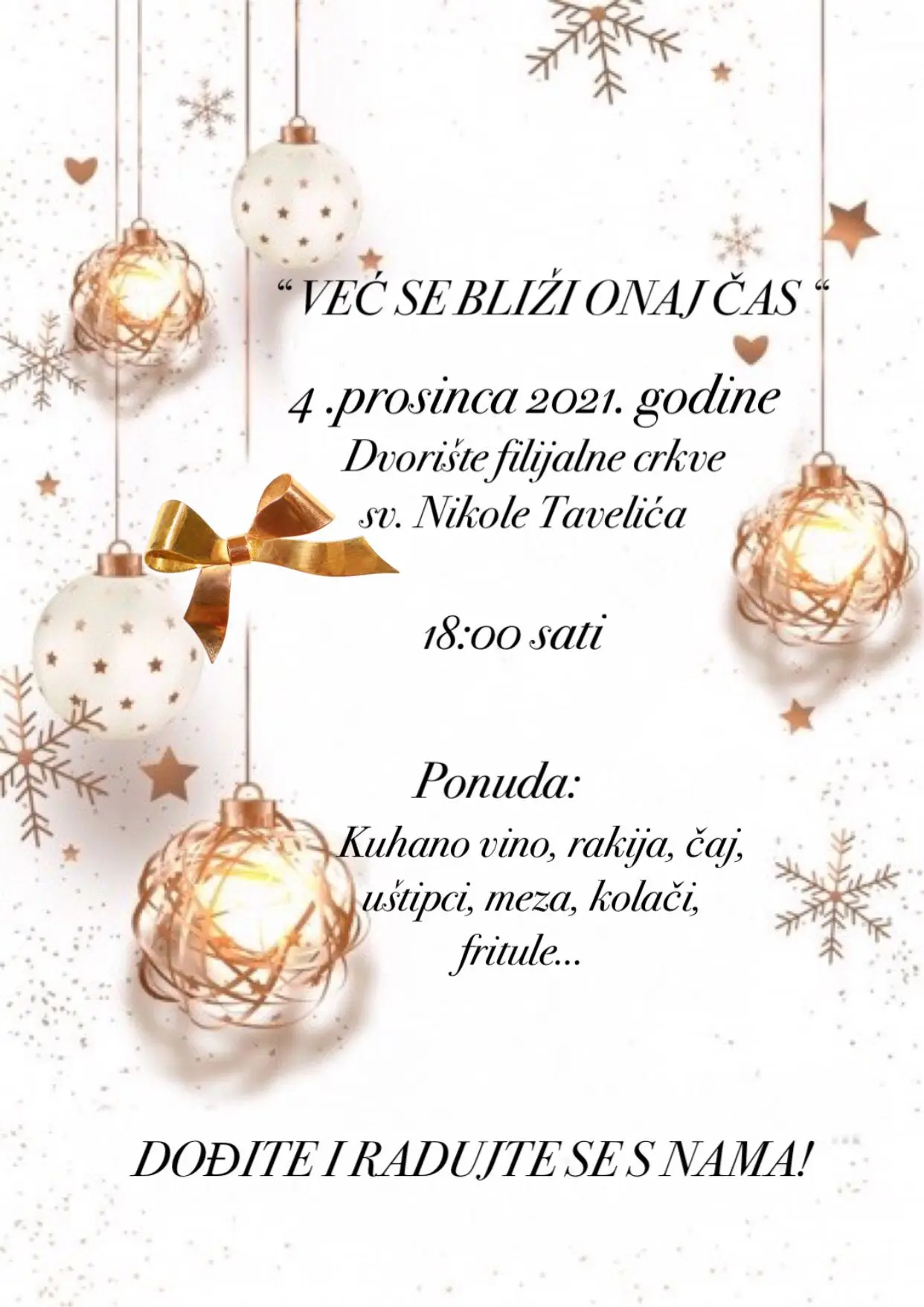 Druženje će se održati 4. prosinca 2021. godine (subota) u 18:00 sati u dvorištu filijalne crkve sv. Nikole Tavelića.