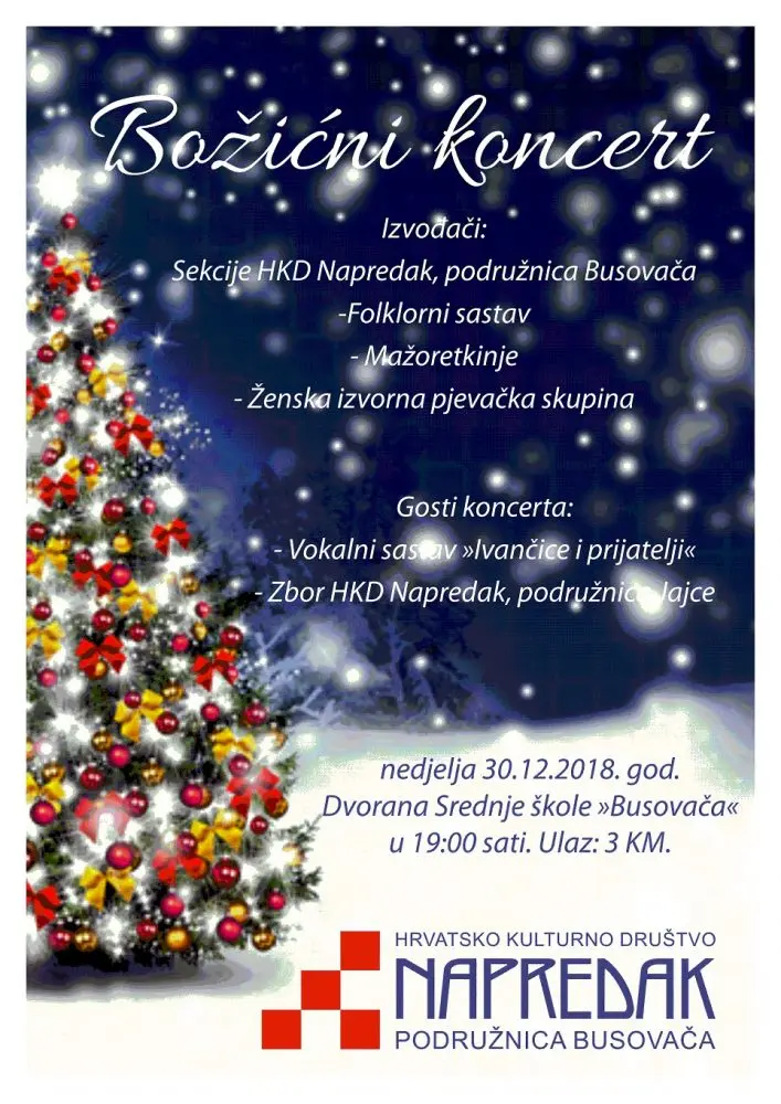 Hrvatsko kulturno društvo Napredak podružnica Busovača organizira svoj jubilarni, 10. „Božićni koncert“ pa s pravom možemo reći da je ovaj događaj već odavno zaslužio naziv tradicionalni.